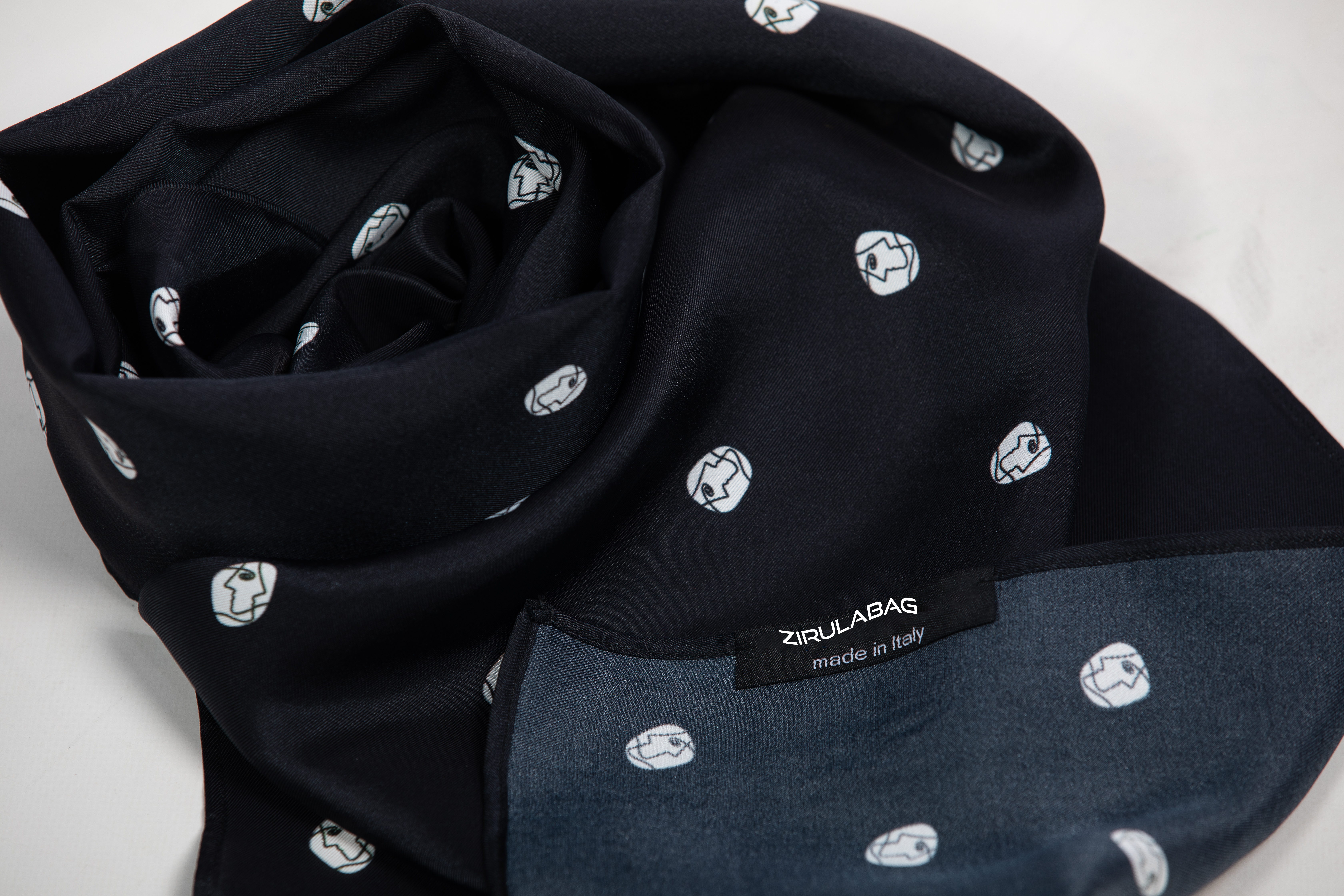 Un accessorio unico che trasforma il tessuto in un racconto visivo. Questo foulard esplora le dualità dell’esistenza attraverso un’affascinante grafica a spirale, composta da parole che si intrecciano in un gioco di contrasti tra bianco e nero. I toni opposti non sono solo un richiamo estetico, ma anche una rappresentazione poetica delle oscillazioni emotive e della complessità interiore. Un pezzo che celebra la bellezza dell’equilibrio tra luce e ombra, ideale per chi cerca accessori che raccontano una storia profonda e personale.